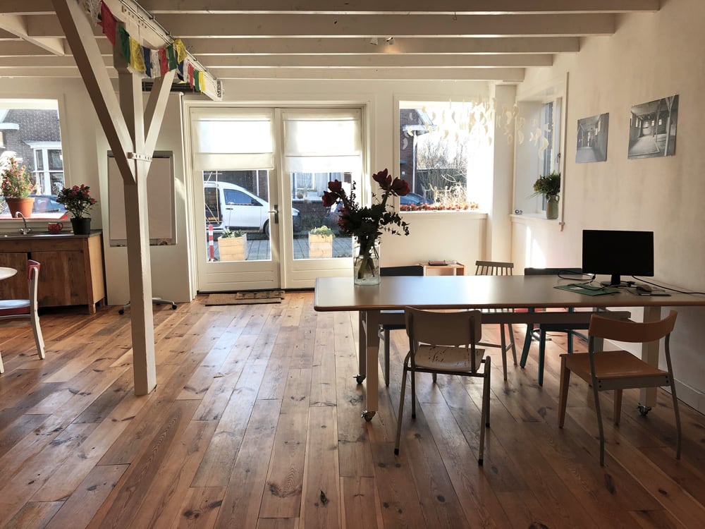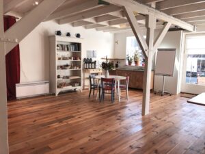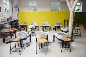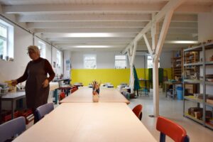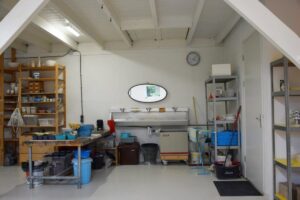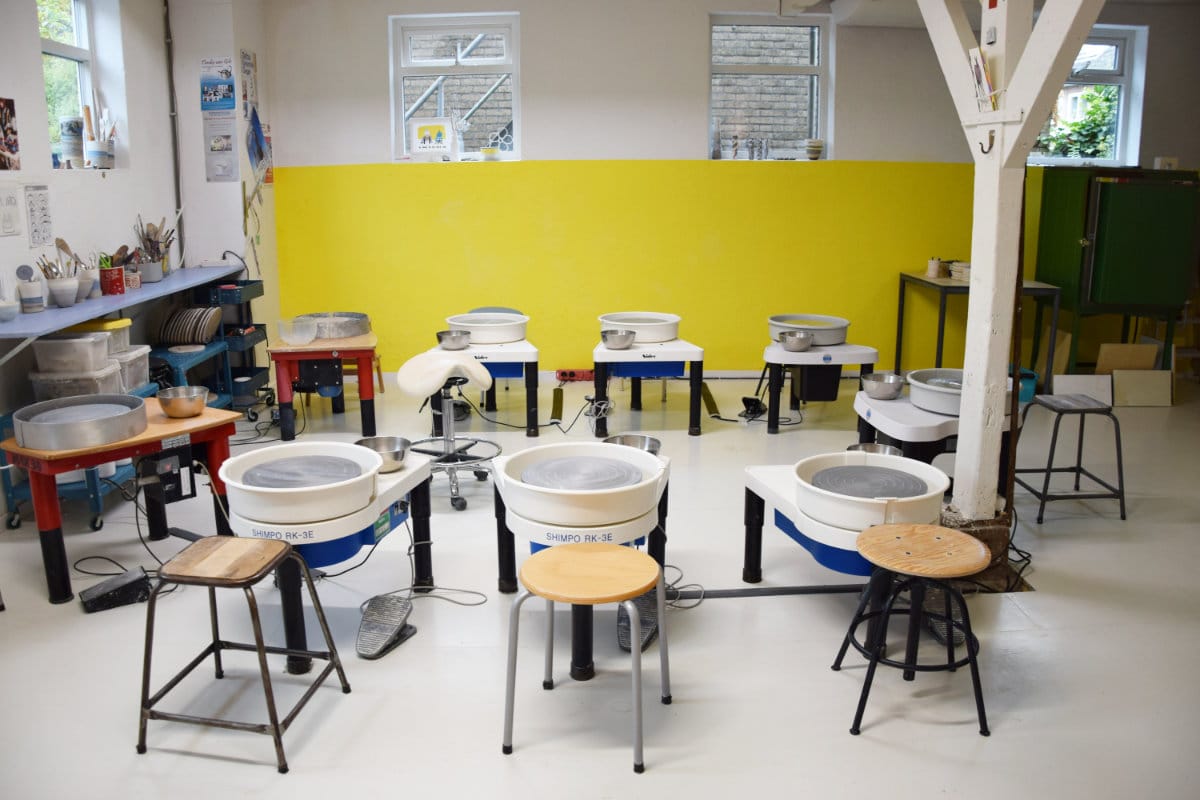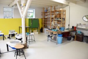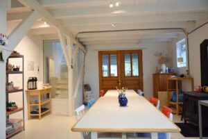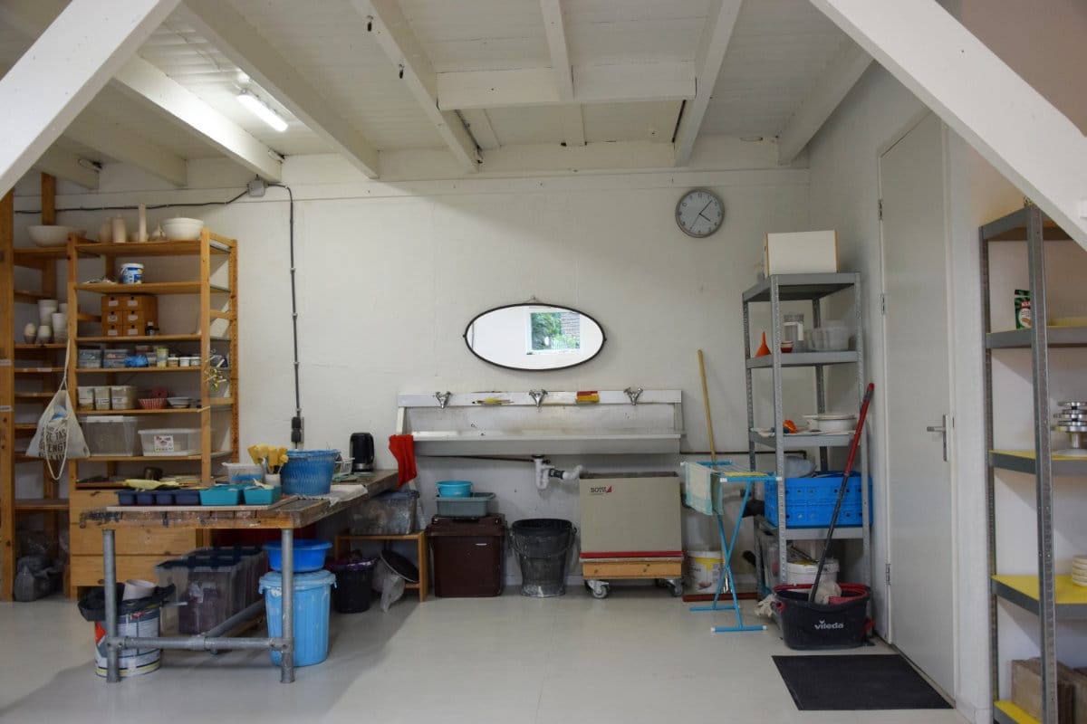 Het keramiekatelier bevindt zich op de begane grond en is ongeveer 85 m2. Een ruim atelier met 9 elektrische draaischijven. Er is ook een voorruimte van ongeveer 55 m2 die voor diverse doeleinden gebruikt kan worden.